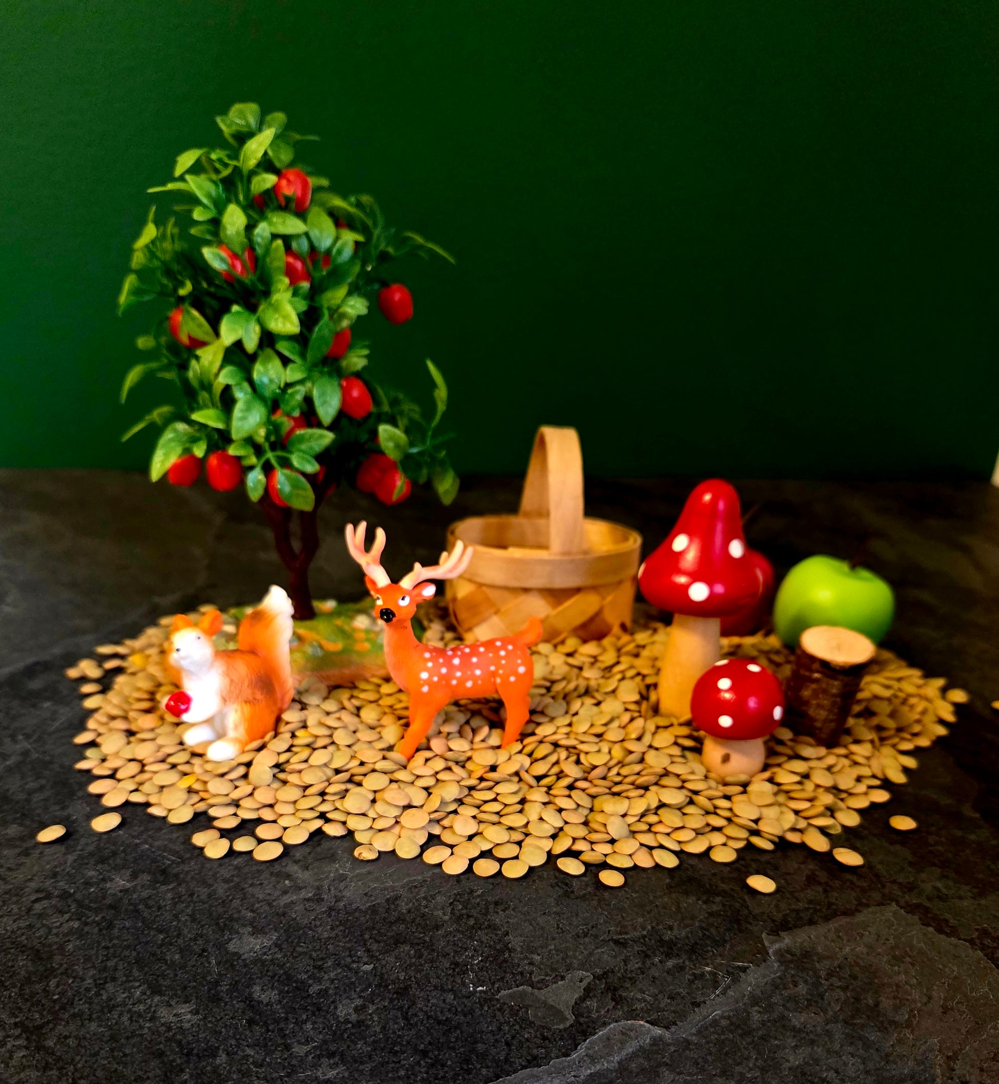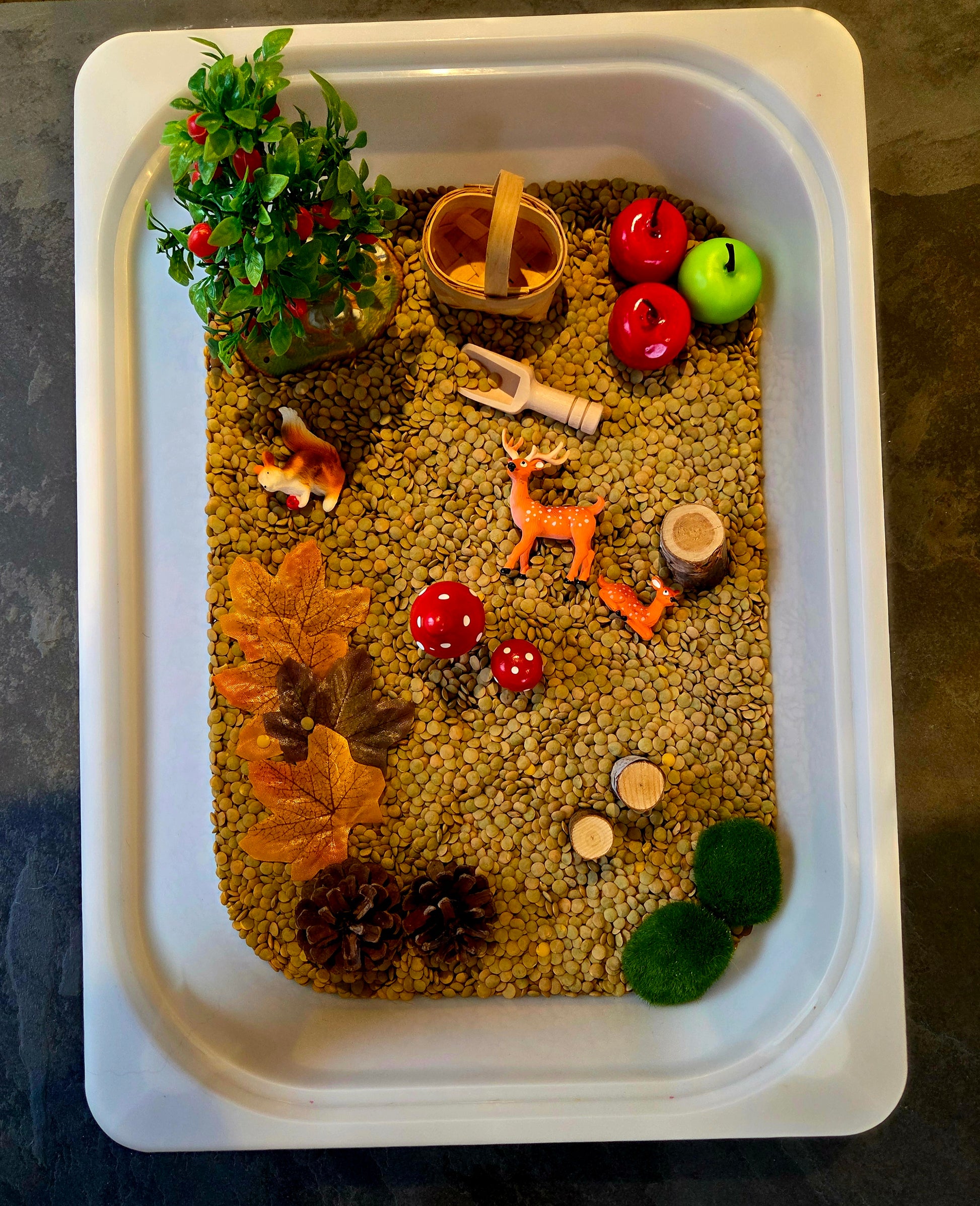 Un bac rempli d'éléments de la forêt et de l'automne, passant par les animaux, les pommes, le panier, la verdure et plus encore.