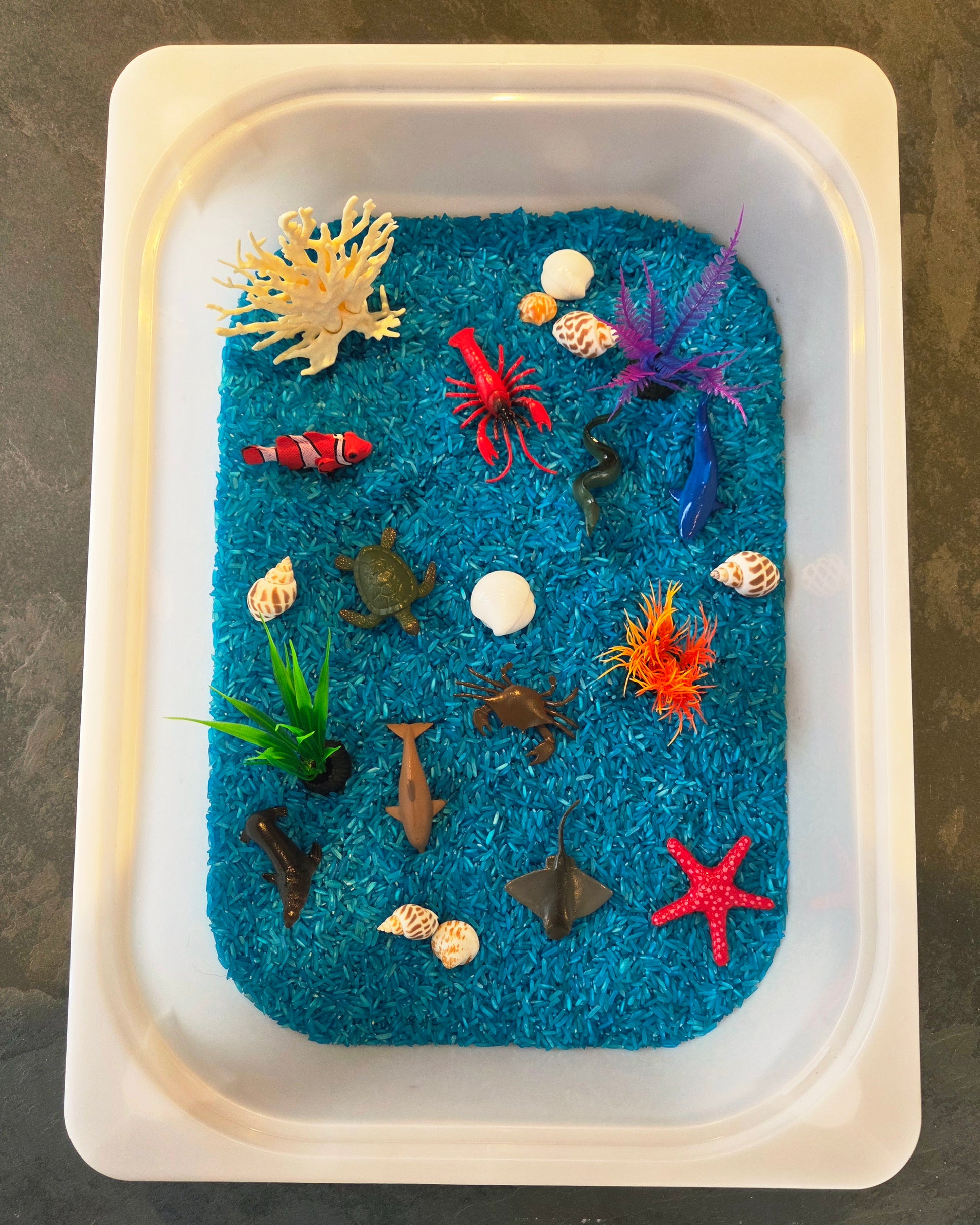 Invitez votre enfant à explorer les mystères de l’océan avec le bac sensoriel Fond marin. Son fond teinté de bleu évoque la profondeur de la mer et crée une ambiance apaisante, propice à la découverte et à l’imagination. Le bac est composé de coquillages, de plantes aquatiques et de diverses créatures marines, offrant une riche variété de textures et de formes à manipuler. Chaque élément encourage le jeu libre, la curiosité et le développement de la motricité fine. Un univers sous-marin captivant où l’enfant peut observer, inventer et s’immerger dans un jeu sensoriel aussi éducatif que ludique